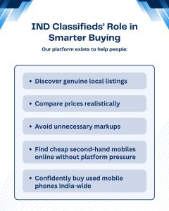 This is why more users buy used mobile phones India-wide through classifieds instead of walking into unknown stores. Itโs also why searches for cheap second-hand mobiles online continue to rise.